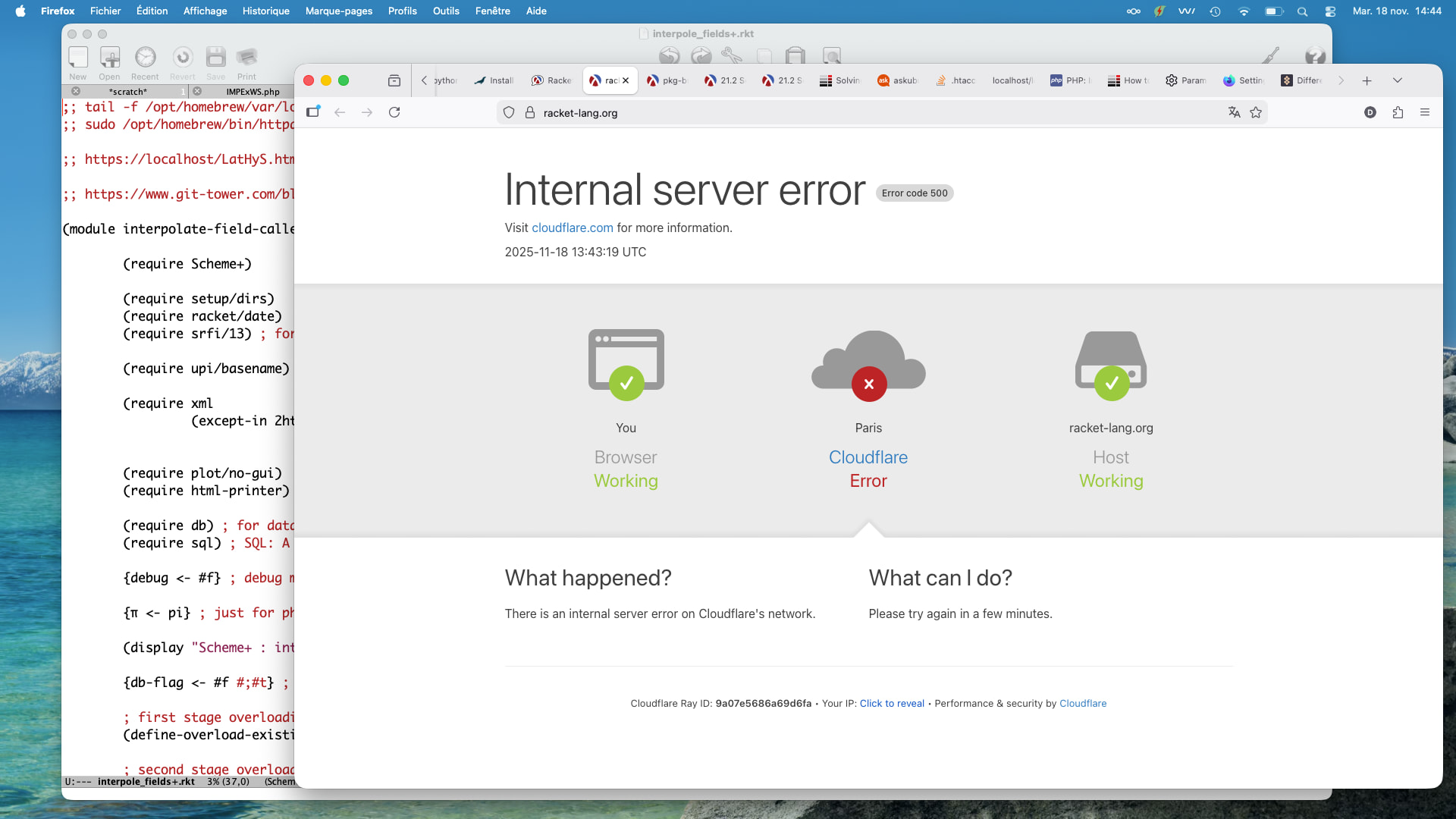 The irony. For all you know the outage was caused by a Racket/Rossete problem: see con.racket-lang.org, first talk when it comes up again.